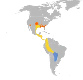 Гнездятся в центральной и южной части США, в колониях. И самка, и самец участвуют в насиживании кладки и заботе о птенцах[2]. За последние 75 лет гнездовые привычки представителей вида претерпели изменения. Ранее они гнездились в лесах и саваннах, теперь же активно используют урбанизированные зоны. Лишь каждая вторая пара выводит птенцов успешно. Средняя продолжительность жизни составляет 8 лет[2].