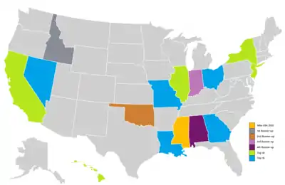 | Лекси Ревелли[10] | 26 | Лиман | Первоначально заняла второе место, но получила титул после того, как победительница Кэти Бознер отказалась от титула за три недели до начала Мисс США из-за своих академических обязательств. | ||
