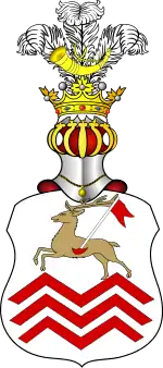 В серебряном поле бегущий олень натурального цвета с раной на бедре, в которой утверждён червлёный прапорец. Под оленем три червлёных литеры М, одна над другой. На щите дворянский коронованный шлем. Нашлемник: три страусовых пера, на которых золотой охотничий рог. Щит держат два серебряных грифа.