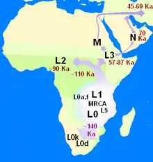 Поскольку популяционные генетики считают родиной митохондриальной Евы Африку, её иногда называют африканской Евой. При древнейшем разделении предковой популяции людей образовались четыре главных гаплогруппы: L0, L1, L2, L3. Из них первая преобладает у бушменов, вторая — у пигмеев[10]. Две последние также имеются у африканских народов, но только от гаплогруппы L3 происходят макрогруппы М и N, носители которых мигрировали из Африки в Евразию.