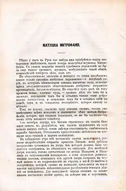 Наружность Митрофании была, если можно так выразиться, совершенно ординарной. Ни её высокая и грузная фигура, ни крупные черты её лица, с пухлыми щеками, обрамленными монашеским убором, не представляли ничего останавливающего на себе внимания; но в серо-голубых на выкате глазах её под сдвинутыми бровями светились большой ум и решительность…