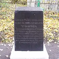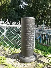 | Могила Павла Михайловича Чубарова (1786—1824) генерал-майора, командира 3-го пехотного корпуса 5-й дивизии 3-й бригады, участника Отечественной войны 1812 года | Колонна из чёрного базальта на могиле подполковника корпуса жандармов Александра Клавдиевича Мишо (1800—1846) и его супруги Варвары Аполлоновны Мишо (1807—1848) | Надгробная плита могилы надворной советницы Варвары Григорьевны Ласковской (1795—1850) |