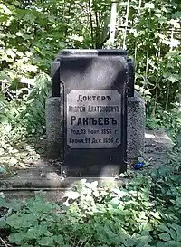 | Памятник на могиле протоиерея Льва (вероятно, Льва Васильевича Теплова, скончавшегося в 1889 году на 78-м году жизни) | Памятник из серого мрамора на могиле доктора Андрея Платоновича Ракеева (1855—1896), выпускника Военно-медицинской академии. |