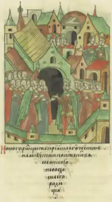 ![]() Новгородцы принимают князя Михаила на княжение | |