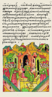![]() Михаил Сигизмундович после убийства отца, миниатюра лицевого свода, 1568—1576 годы | |