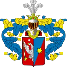 Описание герба: Выписка из Гербовника Щит разделён перпендикулярно на две части, из них в первой в красном поле виден до половины вылетающий белый орёл с распростёртым крылом, держащий в лапе серебряную шпагу, обвитую лаврами, и над орлом серебряная шестиугольная звезда. В левой части разделённой диагонально к правому нижнему углу на два поля: голубое и красное, изображена шестиугольная золотая звезда. Щит увенчан дворянскими шлемом и короной. Нашлемник: три страусовых пера. Намёт на щите голубой, подложенный золотом. Герб рода Михалковых внесён в Часть 5 Общего гербовника дворянских родов Всероссийской империи, стр. 64. |