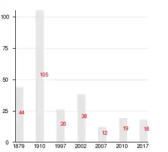 Число жителей по семейным спискам 1879 г.: 21 м. п., 23 ж. п.; по приходским сведениям 1879 г.: 22 м. п., 24 ж. п[2].