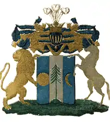 На щите дворянский коронованный шлем. Нашлемник: три страусовых пера. Намёт на щите голубой, подложенный золотом. Щитодержатели: лев и единорог. (Гербовник IX, 40).