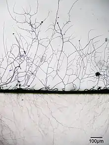 Мицелий (грибница) — вегетативное тело грибов и актиномицетов (некоторые исследователи, подчёркивая бактериальную природу актиномицетов, называют их аналог грибного мицелия тонкими нитями), состоящее из тонких (1,5—10 мкм толщиной у грибов и 0,5—1,0 мкм у актиномицетов) разветвлённых нитей, называемых гифами. Развивается в субстрате и на его поверхности.