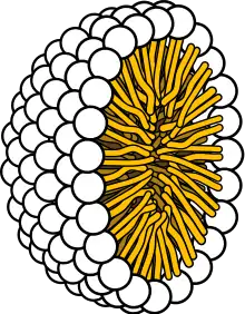 В каждой молекуле длинный гидрофобный радикал связан с полярной (гидрофильной) группой. При образовании мицеллы молекулы объединяются так, что гидрофобные радикалы образуют ядро (внутреннюю область), а гидрофильные группы — поверхностный слой мицеллы. Минимальную концентрацию поверхностно-активных веществ в растворе, при которой в системе образуются устойчивые мицеллы, находящиеся в равновесии с неассоциированными молекулами поверхностно-активного вещества, называют критической концентрацией мицеллообразования. Если дисперсионной средой является органическая жидкость, ориентация молекул в мицелле может быть обратной: ядро содержит полярные группы, а гидрофобные радикалы обращены во внешнюю фазу (обратная мицелла)[3]. Мицеллы - частицы в коллоидных системах, состоящие из нерастворимого в данной среде ядра очень малого размера, окружённого стабилизирующей оболочкой адсорбированных ионов и молекул растворителя. Например, мицелла сульфида мышьяка имеет строение: