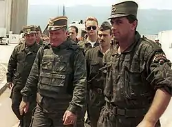 ![]() Ратко Младич во время переговоров при посредничестве ООН в аэропорту Сараева, 1993 год | |