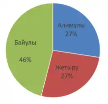 - Байулы 500—550 тысяч, в том числе: адай — 80—150 тысяч, байбакты — 40 тысяч, берш — 45 тысяч, таз — 20 тысяч, шеркеш — 45 тысяч, маскар — 20 тысяч, тана — 25 тысяч, кызылкурт — 40 тысяч, алтын — 70 тысяч, жаппас — 50 тысяч, ысык — 20 тысяч, есентемир — 20 тысяч, алаша — 45 тысяч.