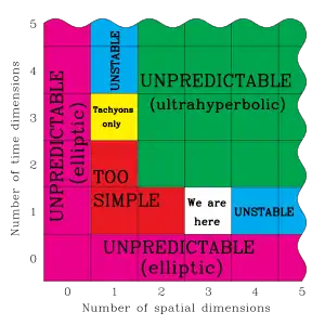 Вопрос возможной многомерности времени тесно связан с антропным принципом. Например, Макс Тегмарк рассматривает гипотезы миров с размерностью времени T > 1 с точки зрения антропного принципа и приходит к выводу о невозможности существования разумной жизни в такой модели мира. В общем случае неизвестно функционирование физических законов в мире с многомерным временем. Если Т отлично от 1, поведение физических систем не может быть выведено из знания соответствующих дифференциальных уравнений в частных производных — задача Коши для волнового уравнения становится плохо определённой. Иными словами, в мире с многомерным временем невозможно точно рассчитать поведение физических систем в будущем, а любой расчёт физических законов будет иметь несколько решений — будущее такой вселенной невозможно спрогнозировать. Разумная жизнь, способная использовать технологии, в подобной вселенной не могла бы возникнуть. Единственный вариант однозначного решения для физических уравнений в мире с многомерным временем — это движение наблюдателя со скоростью света, когда время для него вообще не существует[2]. Таким образом, соблюдение антропного принципа исключает любые варианты мира помимо N = 3 и Т = 1 (или N = 1 и Т = 3 в других концепциях)[2]. Более того, Тегмарк утверждает, что если T > 1, протоны и электроны были бы неустойчивы и могли бы распадаться на более массивные частицы. (Это не проблема, если частицы имеют достаточно низкую температуру.) При T > 1 субатомные частицы, распадающиеся в течение определённого периода, вели бы себя непредсказуемо, геодезическая линия не обязательно была бы максимальной для времени[2].