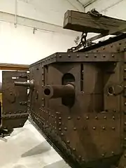 На фото слева показано расположение стволов снаружи по бокам башни британской зенитной самоходной установки Leopard 2 Marksman, по центру — симметричное расположение стволов по бортам корпуса на немецком опытном танке VT1-2, справа — разнонаправленное расположение стволов с правого борта британского серийного танка Mk IV | ||||||||||