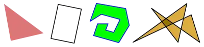 Многоуго́льник — геометрическая фигура, обычно определяемая как часть плоскости, ограниченная замкнутой ломаной. Если граничная ломаная не имеет точек самопересечения, многоугольник называется простым[1]. Например, треугольники и квадраты — простые многоугольники, а пентаграмма — нет.