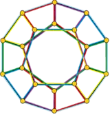 | Многоугольники Петри являются внешними границами этих ортогональных проекций. Синим выделены «передние» рёбра, а серым цветом показаны задние рёбра. Концентрические кольца вершин вершин отсчитываются снаружи внутрь с обозначением: , кончая нулём, если нет центральных вершин. | ||||