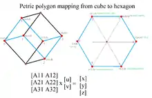 Петриал куба, {4,3}π, имеет 8 вершин, 12 рёбер и 4 пространственных шестиугольника, показанных красным, зелёным, синим и оранжевым на рисунке. Он имеет эйлерову характеристику 0, и его можно рассматривать как четыре шестиугольные грани тороидальной шестиугольной мозаики {6,3}(2,0).