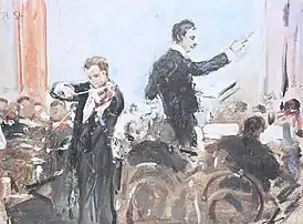 ![]() На скрипке − Могилевский, за пультом Кусевицкий (картина немецкого импрессиониста Роберта Штерля) | |