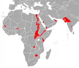 Страны распространения: Бенин, Ботсвана, Буркина Фасо, Демократическая Республика Конго, Джибути , Египет, Эфиопия, Гамбия, Гана, Гвинея-Бисау, Индия, Иран, Израиль, Кения, Мали, Мавритания, Нигер, Нигерия, Оман, Пакистан, Саудовская Аравия, Сенегал, Сомали, Судан, Танзания, Того, Уганда, Зимбабве, Йемен. Не встречается на высотах более 200 м над уровнем моря. Местообитания во всем диапазоне связаны с открытым редколесьем, вдоль рек в лесистой саванне. Требует укрытия в скалах или каменных зданиях в течение дня. Создаёт поселения малыми и большими колониями от нескольких до тысячи особей. Питается молями и жуками.