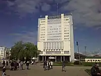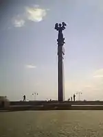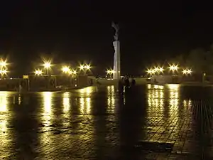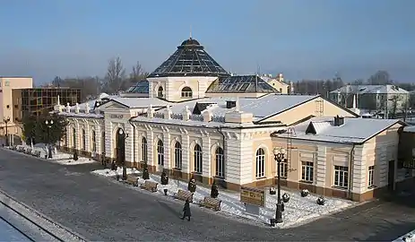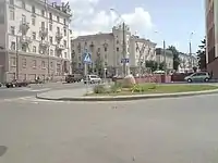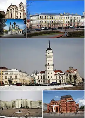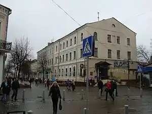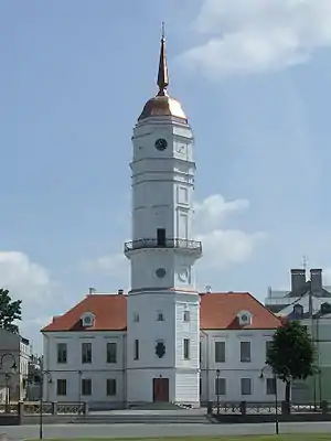 Достопримечательности![]() Дом купца Антошкевича на Ленинской улице (1698). В Могилёве сохранилось относительно немного достопримечательностей (большинство было взорвано в послевоенное время). Из культовых сооружений сохранились действующий православный Свято-Никольский женский монастырь, католический собор Успения и святого Станислава, кафедральный собор Трёх Святителей, Крестовоздвиженская церковь (XVII век), Свято-Крестовоздвиженский собор (1869). Исторический центр города — пешеходная улица Ленинская с сохранившимися зданиями (XVIII—XIX века). Драматический театр, построенный в 1888 году, здание железнодорожного вокзала. В 2008 году было восстановлено здание городской ратуши. Площадь Славы (бывшая Советская площадь)![]() Площадь Славы. ![]() Памятник на площади Славы. Советская площадь ранее носила название Торговая. Внизу, если смотреть с высокого берега, слева от моста через Днепр раньше была пристань. Могилёв был крупным речным портом. После присоединения в 1772 году Могилёва к Российской империи Торговая площадь получила название Губернаторской. Новый её облик разрабатывали известные русские архитекторы Н. Львов и В. Стасов. С площади сносят лавки и другие постройки, а по её периметру воздвигаются 4 двухэтажных здания в стиле классицизма: губернаторский дом, здание губернского правления, дом вице-губернатора и здание, в котором находились земский суд, врачебная управа, архив, а позже — окружной суд (сейчас здесь краеведческий музей). Из всего комплекса сохранилось только здание, в котором сейчас размещается краеведческий музей. В 1919 году площадь получила новое название: в честь II-го губернского съезда Советов (проходил в здании городской управы), объявившего 15 декабря 1917 года советскую власть в Могилёвской губернии. С этого дня она стала называться Советской. Во время немецкой оккупации в 1941—1944 года Советская площадь — место казни патриотов-подпольщиков. Площадь дважды находилась в зоне ожесточённых боёв за город в 1941 и 1944 годах. Не миновали её и бомбардировка Могилёва советской авиацией в 1943 году. Кучи обломков остались на месте дома губернатора и губернского правления, только коробка напоминала о доме вице-губернатора (снесён в 1950-х годах), частично пострадала ратуша и другие постройки. В конце 1940-х годов руины снесли. 1 июля 2014 года Советская площадь переименована в площадь Славы[39]. Городская ратуша![]() Городская ратуша. В 1578, через год после получения городом грамоты на магдебургское право, в Могилёве началось возведение городской ратуши[40]. Первоначально ратуша была деревянной, поэтому неоднократно сгорала дотла, и её местонахождение менялось. 4 сентября 1679 года горожане приступили к строительству каменной ратуши, основной корпус которой был возведён к 1681 году, а полностью строительство завершили в 1698 году. Здание покрыли черепицей, соорудили 2 крыльца (большое и малое), над которыми размещались позолоченные флюгера (ветреницы). Высота 8-гранной 5-ярусной башни со шпилем равнялась 46 м. Во время Северной войны в сентябре 1708 года ратуша сгорела, но была быстро восстановлена, а в 1733 году в ней проведён большой ремонт. Здание было самым высоким в городе. В 1780 году с её смотровой площадки Могилёвом любовались императрица Екатерина II и император Священной Римской империи Иосиф II. Во время Великой Отечественной войны ратуша была сил