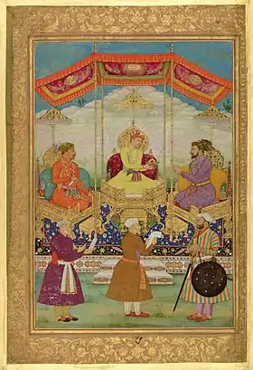 Шах Джахан принимает персидского посла Мухаммада Али Бека. ок. 1633, Лист из "Падишахнаме", Королевская библиотека, Виндзор.