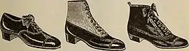 В 1920-е популярностью пользовались несколько видов женской обуви: открытые туфли на ремешках, чаще всего буквой «Т», туфли на завязках и туфли-лодочки.[2] Различались повседневные и вечерние, нарядные туфли — последние были более обильно декорированы, зачастую с использованием ярких страз и аппликаций. Самыми модными дизайнерами женской обуви той эпохи были Андре Перуджа и Сальваторе Феррагамо, Шарль Журдан и Израэль Миллер.