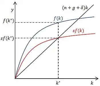 Если инвестиции на единицу эффективного труда превышают выбытие капитала на единицу эффективного труда , то капиталовооружённость труда с постоянной эффективностью растет, в противном случае — падает[16]. В стационарном состоянии уровень капитала на единицу эффективного труда постоянен, то есть , а значит устойчивый уровень капиталовооружённости труда с постоянной эффективностью находится из уравнения[17][18]: