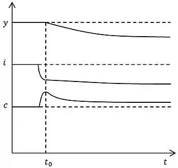Поведение потребителей в явном виде в модели не рассматривается. Функция полезности отсутствует. Вместо этого имеется экзогенно задаваемая норма сбережений , , означающая, что домохозяйства сберегают долю своего дохода , а оставшуюся долю тратят на потребление, и это соотношение не зависит от происходящих в экономике событий[14].