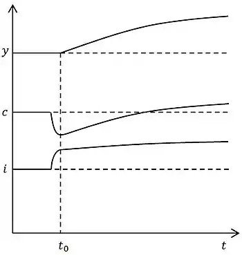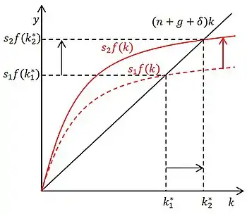 При росте нормы сбережений инвестиции превышают выбытие капитала, растет до достижения равновесия при более высоком уровне . В процессе перехода к новому стационарному состоянию темп роста производительности труда будет опережать темп технического прогресса и при достижении нового равновесия они сравняются. Переход к новому стационарному состоянию при изменении нормы сбережений показан графически на иллюстрации.