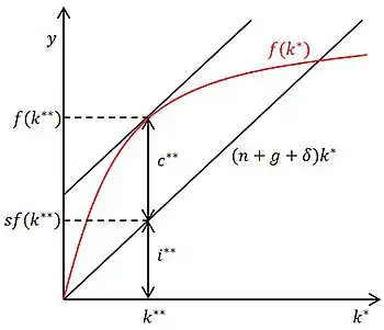 После нахождения устойчивого уровня следующей задачей является нахождение такого значения нормы сбережений , при котором в устойчивом состоянии потребление на единицу эффективного труда максимально. То есть, необходимо решить задачу[20][21]: