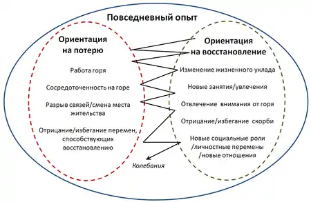 Колебанием называется динамический процесс, являющийся основой успешного совладания. Процесс включает в себя чередование двух стадий: ориентация на потери и ориентация на восстановление. Данный когнитивный процесс является регулирующим. Колебания необходимы для оптимального восстановления психического состояния с течением времени, так как подавление отрицательных эмоций требует усилий и приводит к продолжающемуся телесному напряжению.[2] Таким образом, копинг с тяжелой утратой — это сложный регулирующий процесс саморегуляции, сочетающий конфронтацию (как фокусирование на потере) и избегание (как уход от мыслей о потере). Важным постулатом модели является то, что колебания между двумя типами стрессоров необходимы для адаптивного совладания.[3]