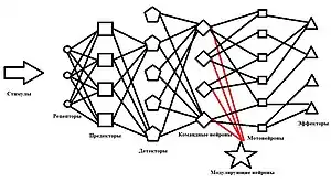 - Исполнительной системы, которая определяет выходной отклик с точки зрения количества командных нейронов (блок 5 — блок 7);