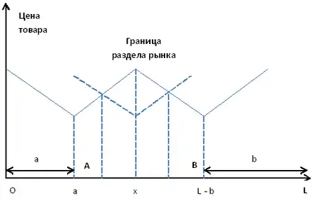Цена товара для потребителя увеличивается пропорционально удалению от фирмы. Потребители покупают товар в фирме А, находясь ближе к ней. Когда цена потребителя при покупке в фирме А сравнивается с ценой потребителя при покупке в фирме В, то возникает безразличный потребитель (ему все равно, где покупать), а также граница раздела между фирмами всего рынка. В случае линейных транспортных издержек раздел между рынками будет проходить посередине отрезка АВ[1].