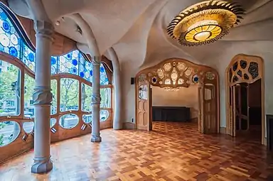 - В том же году появились первые дома и внутренняя отделка в стиле модерн в Брюсселе, спроектированные Полом Анкаром и Виктором Орта — особняк Тасселя, которого был завершен в 1893 году. Орта был первым, кто использовал кривую линию, как символ всего движения стиля. Изменчивость пространств повторяло изгибы растений, которые окружали изделия из железа, мозаики, фрески и витражи, элементы как структур, так и орнаментов. Орта проектирует уникальное здание с мебелью, которая соответствует ритму стен и архитектуры; он разрабатывает узоры ковров, конструирует мебель: это явление получает название «Тотал Арт». После этого Орта переехал в Париж, где его работы адаптировал к своим проектам Гектор Гимар, который видел его работу в Брюсселе и применил его стиль для оформления входов в новое Парижское метро .