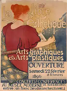 - В 1894 году, находясь в бельгийской столице, Генри Ван де Вельде опубликовал брошюру «Расчистка искусства» (фр. Le Déblaiement d’Art), которая сделала шаг назад к современным художественным разработкам и осудила мир институционализированного искусства. Это отражение — первая интеллектуализация двух сильных идей стиля модерн: ценность декоративного искусства наряду с так называемым благородным искусством и важность общей гармонии в любой декоративной работе.[18]