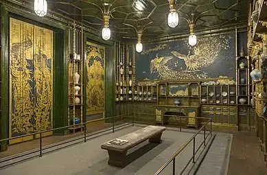 Одними из ранних прототипов нового стиля являлись Красный дом с интерьерами Морриса и архитектурой Филиппа Уэбба и Павлинья комната Джеймса Уистлера. Оформление Павлиньей комнаты включало в себя многие признаки будущего стиля – плоскостные живописные панно на стенах, прерванные резными деревянными панелями прихотливого рисунка, гнутые линий контуров, сочетание графического начала с декоративностью.