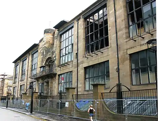Для архитектуры модерна и дизайна мебели наиболее важным центром развития в Великобритании был Глазго, во главе с Чарльзом Ренни Макинтошем и созданной им Школой Глазго, чьи работы были созданы под влиянием стиля Шотландских баронов, японского искусства и Венского сецессиона.[23] Макинтош выставлял свои проекты на международных выставках в Лондоне, Вене и Турине. Его архитектурные творения включали здание «Глазго Геральд» (англ. Glasgow Herald) (1894) и библиотеку Школы искусств в Глазго (1897). Он также зарекомендовал себя как дизайнер мебели и декоратор, работая в тесном контакте со своей женой, Маргарет Макдональд Макинтош. Вместе они создавали яркие проекты, в которых сочетались геометрические прямые линии с мягко изогнутыми цветочными украшениями.