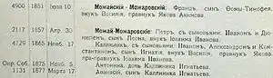 «Możajski (Możajskis) herbu Pogonia III. Polska rodzina slachecka. Nazwisko wzięli od posiadłości rodowej Możary w powiecie owruckim, stąd też niekiedy pisali się: Możarski i Możarycki. Chociaż nosili to samo nazwisko, w Rosji, potomkami Dymitra Dońskiego, którzy wygaśli już w XVI wieku. S. Uruski (Rodzina..., t. XI, 319) podawał o nich: „Zagrodowa szlachta w powiecie owruckim. Mikołaj 1621 roku notowany w Metryce koronnej; nieznany, rotmistrz, w Prusach 1629 roku". Jak świadczą zachowane przekazy archiwalne, Możajscy herbu Pogonia Tertia należeli do starożytnej szlachty polskiej ziemi wołyńskiej. Dziedziczyli dobra Nowy Dworzec i Możarycze w powiecie owruckim, mieszkali również w Kamieńcu. Ich rodowitość szlachecką potwierdzało Wołyńskie Zgromadzenie Deputatów Szlacheckich 16 grudnia 1802, 14 września 1832, 2 czerwca 1834, a Departament Heroldii Senatu Rządzącego w Petersburgu - 16 stycznia 1881 roku (Państwowe Archiwum Obwodowe w Żytomierzu, f. 146, z. 1, nr 3957)».[25]