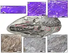 Несмотря на многочисленные ископаемые остатки различных мозазавров, происходящих со всего мира, о их кожном покрове известно немного. Несколько образцов, тем не менее, сохраняют окаменевшие отпечатки чешуи. До открытия хорошо сохранившихся отпечатков из позднего маастрихта Иордании[45], кожный покров мозазавров описывался в основном на базе ископаемых остатков довольно примитивных мозазавров из сантона-нижнего кампана, таких как знаменитый образец тилозавра KUVP—1075 из штата Канзас[46]. Материал из Иордании показывает, что тела мозазавров, а также перепонки между пальцами на передних и задних конечностях, были покрыты мелкими, перекрывающимися, ромбовидной формы чешуйками, напоминающие таковые у некоторых змей. Также как и у многих современных рептилий, чешуя мозазавров была разнообразной по типу и размеру на различных участках тела. У обнаруженных образцов имелось два основных типа чешуй: килеватая чешуя на верхних участках тела и гладкая чешуя на нижних[45].