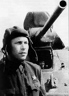 ![]() Гвардии капитан Н. Д. Моисеев у своего танка Т-34, Юго-Западный фронт, июль 1942. | |