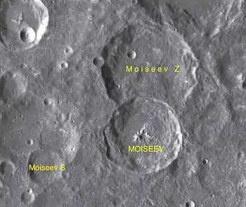 ![]() Снимок зонда Lunar Reconnaissance Orbiter. Сверху вниз – кратер Герц, сателлитный кратер Моисеев Z, кратер Моисеев. | |