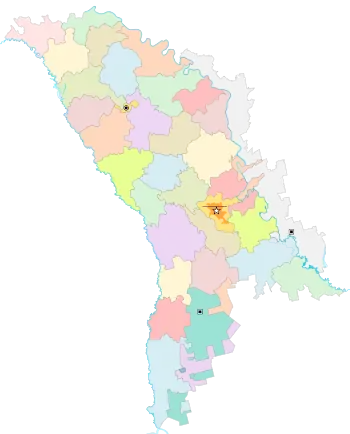 В административном отношении Молдавия разделена на 32 района, 13 муниципиев (Кишинёв, Бельцы, Бендеры[42], Комрат, Тирасполь[42], Кагул, Чадыр-Лунга, Единец, Хынчешты, Оргеев, Сороки, Страшены и Унгены[43]), 1 автономное территориальное образование (Гагаузия) и административно-территориальные единицы левобережья Днестра[44].