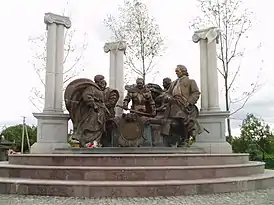 На памятнике изображены гетманы: Демьян Многогрешный, Иван Самойлович, Иван Мазепа, Филипп Орлик и Кирилл Разумовский.