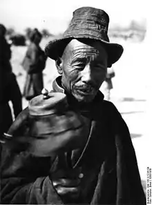 Пожилая тибетская женщина с молитвенным барабаном