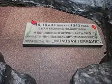 15, 16 и 31 января 1943 года в 58-метровый шурф краснодонской шахты № 5[6] были сброшены 71 человек, из которых часть была предварительно расстреляна, а часть сброшена живыми.[7] Сорок девять из них были молодогвардейцами, остальные 22 члены местной подпольной партийной организации. В их числе были Виктор Третьякевич, Евгений Мошков, Николай Жуков, Иван Земнухов, Ульяна Громова, Сергей Тюленин, Анна Сопова, Лидия Андросова, Ангелина Самошина, Майя Пегливанова, Александра Дубровина, Александра и Василий Бондаревы, Антонина Елисеенко, Владимир Жданов, Клавдия Ковалёва, Нина Герасимова, Сергей Левашов, Демьян Фомин, Антонина Иванихина, Антонина Мащенко и многие другие подпольщики-антифашисты. Вслед за людьми каратели скинули в шахту шахтёрские тележки и бросили несколько гранат.