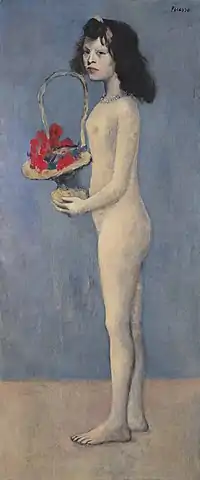 Девушка-подросток изображена обнажённой с ниткой жемчуга на шее и с розовой лентой в тёмных волосах. В её руках корзина с красными цветами. Фигура девушки написана в профиль на голубом фоне. Её почти детский взгляд обращён к зрителю. Картина сочетает в себе противоречивые элементы невинности и опыта. Более ранний рисунок пером и чернилами обнаруживает, что Пикассо первоначально намеревался изобразить её в белом платье и с красными цветами, как на первом причастии.