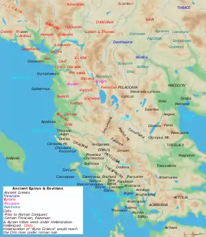 - Borza, 1992, pp. 62, 78, 98; Encyclopædia Britannica ("Epirus"), 2013; Errington, 1990, p. 43; Hammond, 1998, p. 19; Hammond, 1994, pp. 430, 433–434; Hammond, 1982, p. 284; Wilkes, 1995, p. 104.
