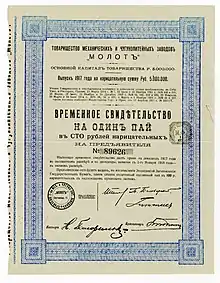 История «Товарищество механических и чугунолитейных заводов „Молот“» связана с именем видного российского промышленника, мецената, политического деятеля, крупнейшего нефтяного магната России XX века С. Г. Лианозова.[2]