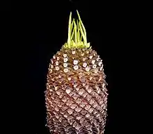 Растение с толстым, очень коротким стволом размером с яйцо и без колючек, покрытым чешуевидными бурыми основаниями листьев, лежащими по спирали, похожим на маленькую сосновую шишку, сверху увенчанную кроной зелёных листьев.