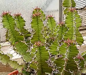 В связи с отсутствием лепестков, циатии похожи на маленькие жёлтые бутоны. Они зеленовато-жёлтого цвета, черешчатые, двудомные, располагаются в трёх параллельных линиях вдоль рёбер между шипов на конечных сегментах ветвей. Они собраны в соцветия по три циатии, женские цветки на конце линии в центре ряда, а двуполые — под ними на внешней стороне. Цветёт летом.
